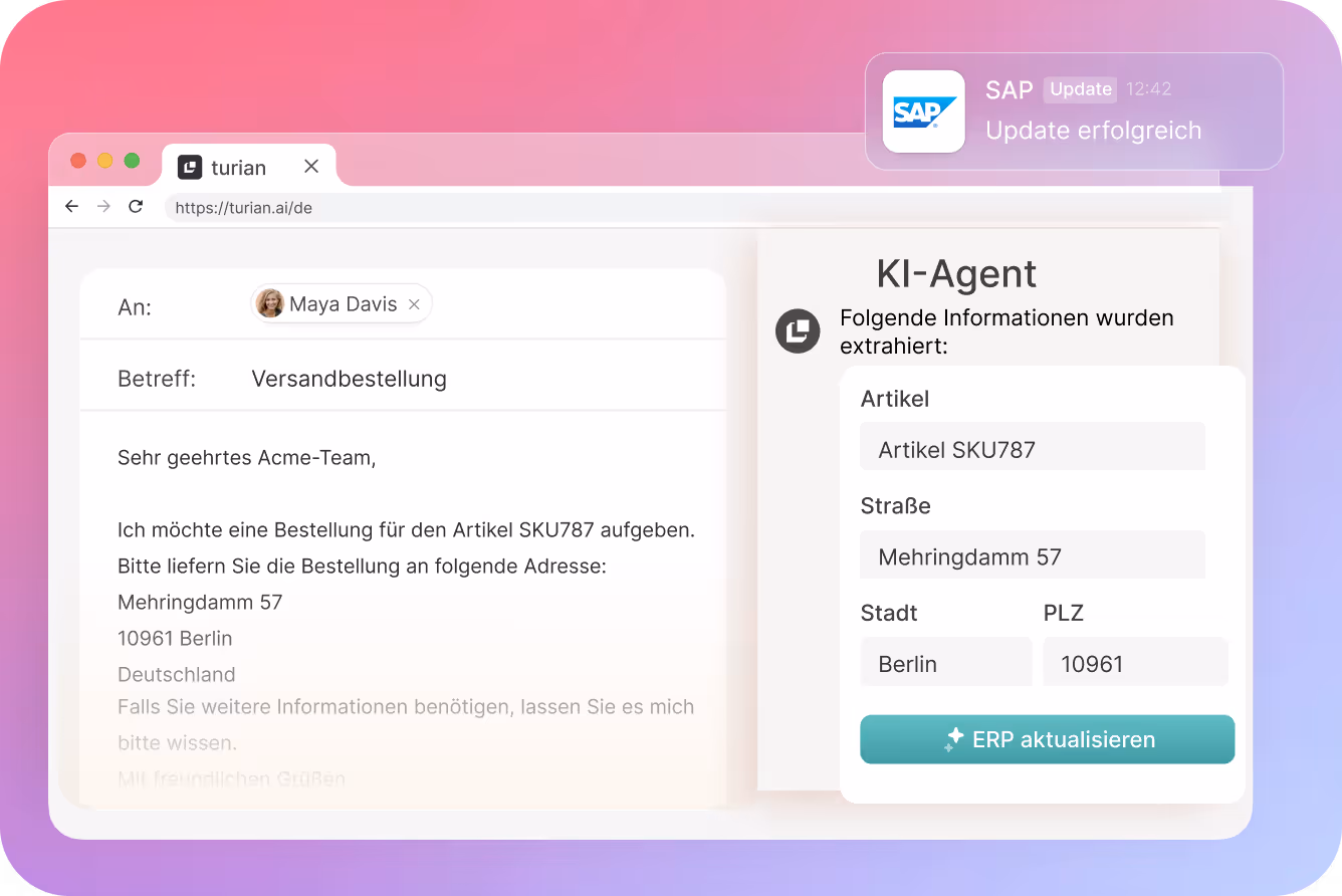 Die KI-Agenten von turian lassen sich nahtlos in Ihre ERP- und CRM-Systeme sowie E-Mail-Postfächer integrieren. Wir bieten Standard-Konnektoren für eine Vielzahl von Tools und Anwendungen.