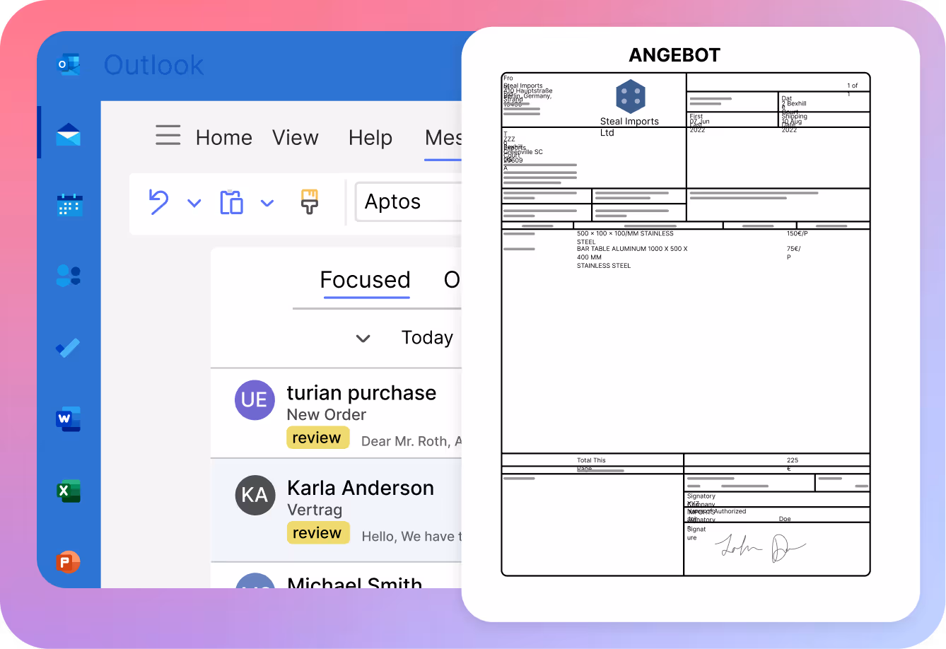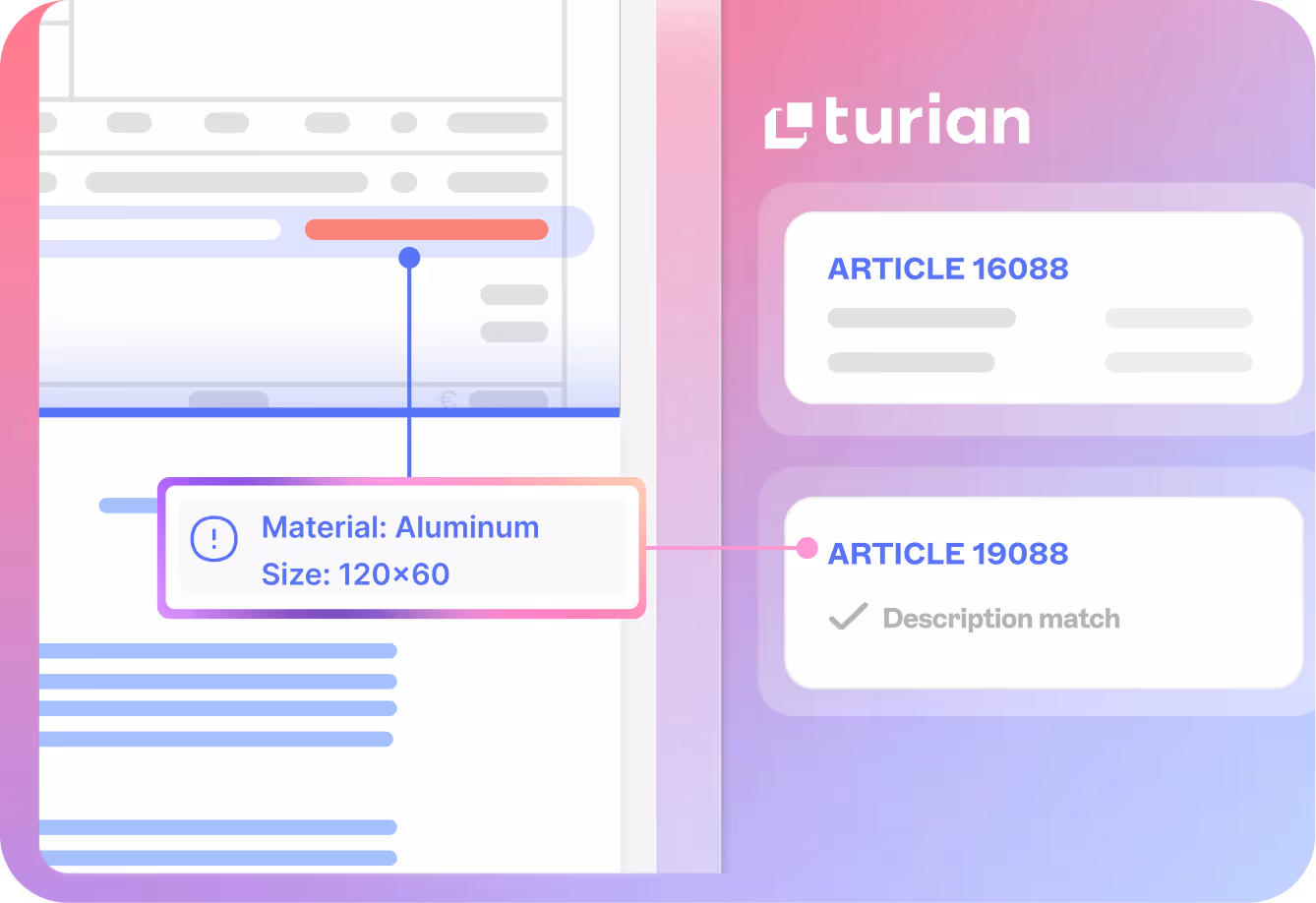 Die KI-Agenten von turian sind nicht auf feste Layouts oder starre Dokumentenformate angewiesen. Verarbeiten Sie jedes Layout aus jeder Quelle: E-Mails, PDFs, GAEB-Dateien oder handschriftliche Dokumente.