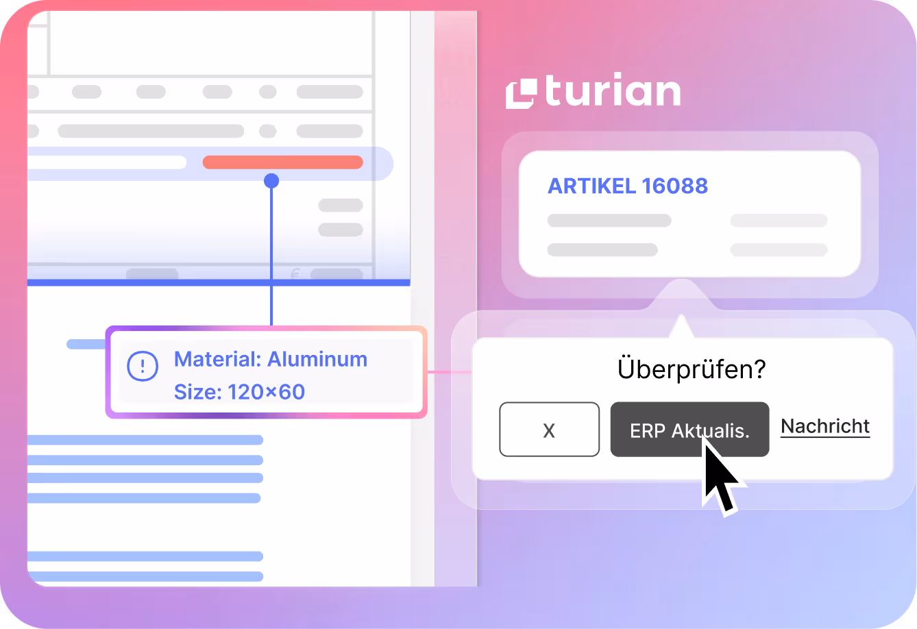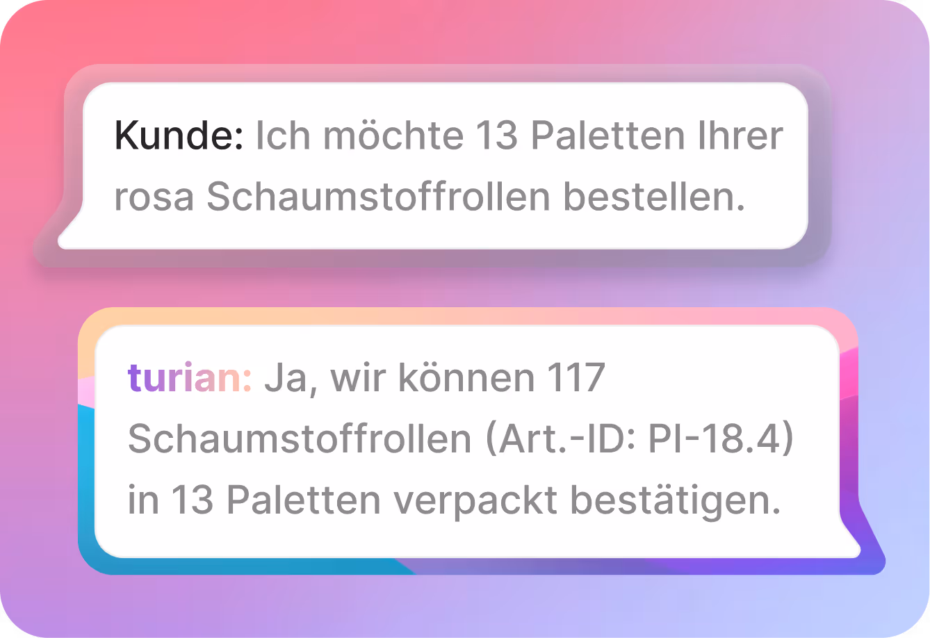 turian lässt sich direkt mit allen gängigen ERP-, CRM- und anderen vorhandenen Tools verbinden. Von SAP über Infor bis hin zu ProAlpha, unsere KI-Agenten finden automatisch die richtigen Produkte, Mengen und Preise. Keine manuellen Zwischenschritte, keine Verzögerungen.