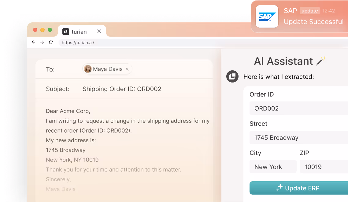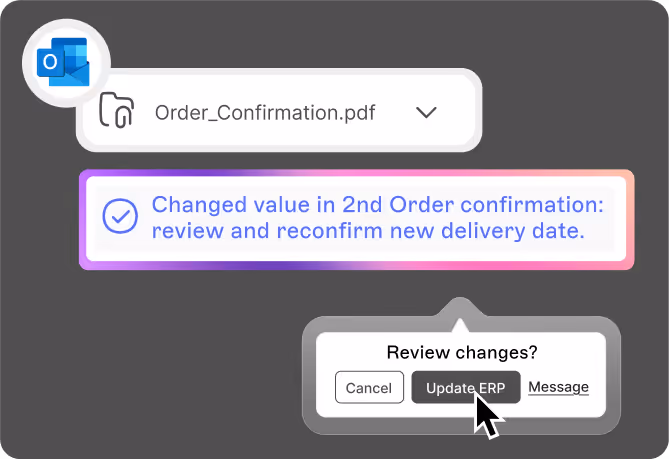 With intelligent recognition of next steps, the AI assistant matches new information with your ERP and performs appropriate updates.