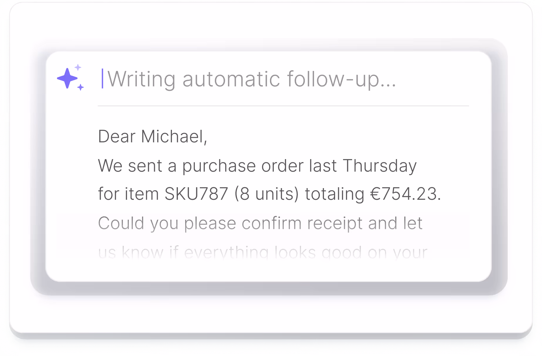 Automatically follow up on missing or delayed delivery dates. turian detects missing confirmations and triggers reminders, no manual tracking needed.