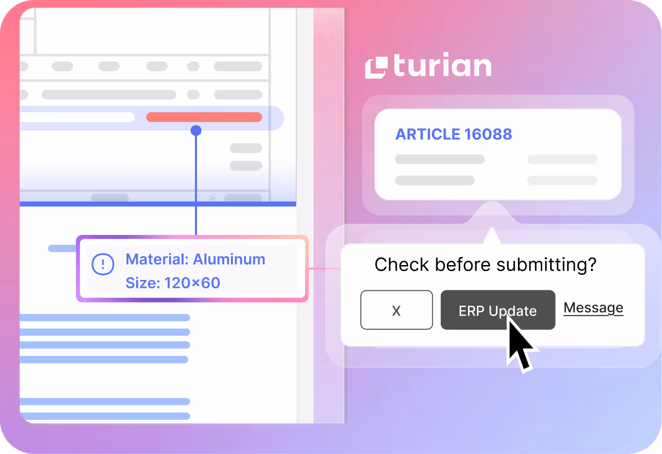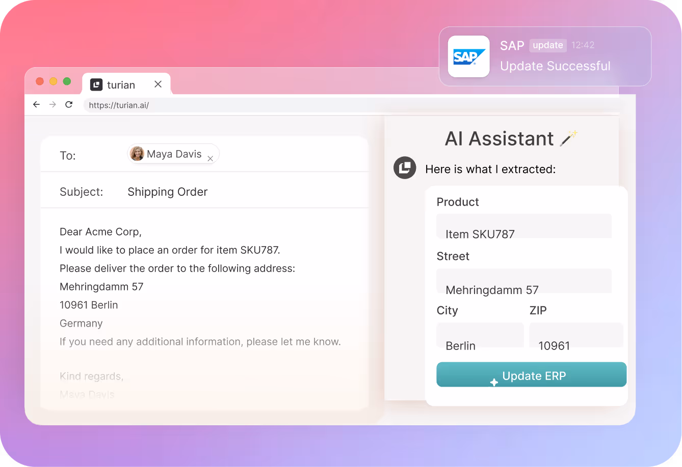turian's AI agents integrate seamlessly with your ERP and CRM systems and email inboxes. We offer standard connectors for a wide selection of tools and applications.